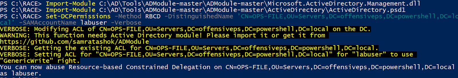 To make it easy to execute ACL related attacks, I have written the RACE toolkit. RACE is dervied from Minimal Rights and ACE. You can find it on my GitHub : https://github.com/samratashok/RACERACE is a PowerShell module for executing ACL attacks against Windows targets.
