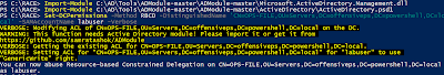 As labuser, run the below command (needs the ActiveDirectory module) to configure RBCD from attacker machine ops-user1$ to ops-file. This enables us to access ops-file as any user when we impersonate the ops-user1 machine: