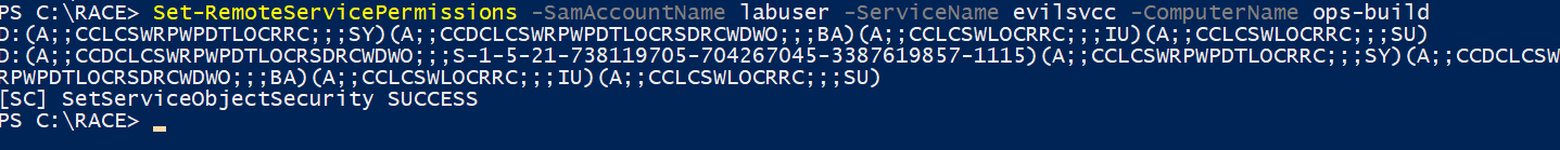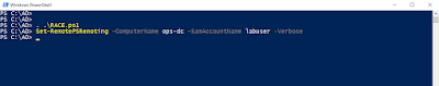 Using the below commands from RACE, we can modify the ACL of the default PSRemoting endpoint. Let's run it on the DC with DA privileges (please ignore 'I/O operation has been aborted'):