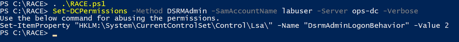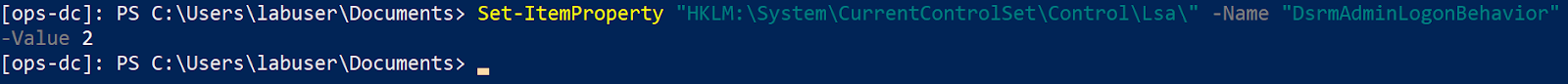 Lets try it. Run the below command to modify the DSRMLogonBehavior registry key and allow labuser to modify it anytime. If the key doesn't exist, it is created: