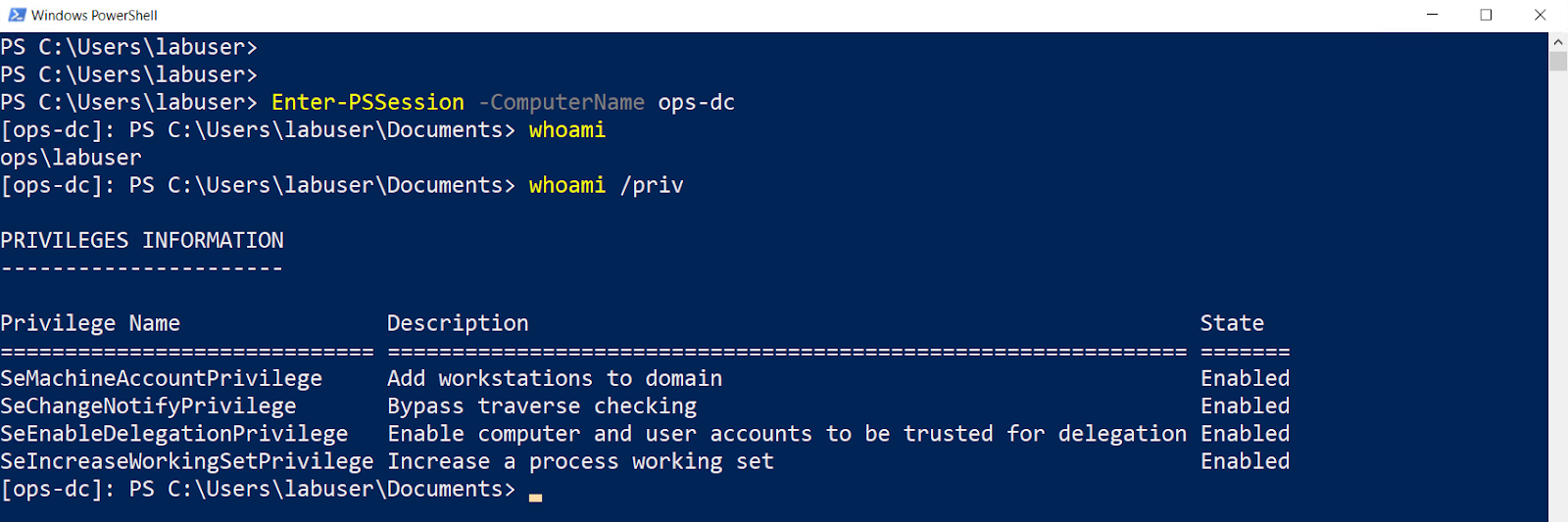 Now, we will be able to access the target machine 'ops-dc' as labuser using PowerShell Remoting. Please note that the privileges will still be of labuser.