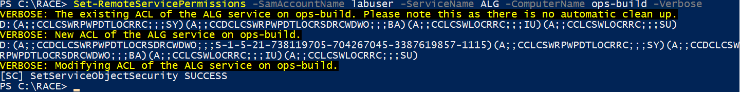 The below command modifies the ACL of ALG service on the target machine to provide 'labuser' enough rights to configure and restart the service: