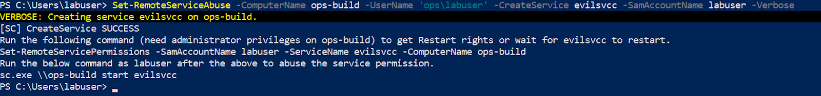 Now, when we restart the 'evilsvc' service, 'labuser' is added to the local administrators group on the target machine.